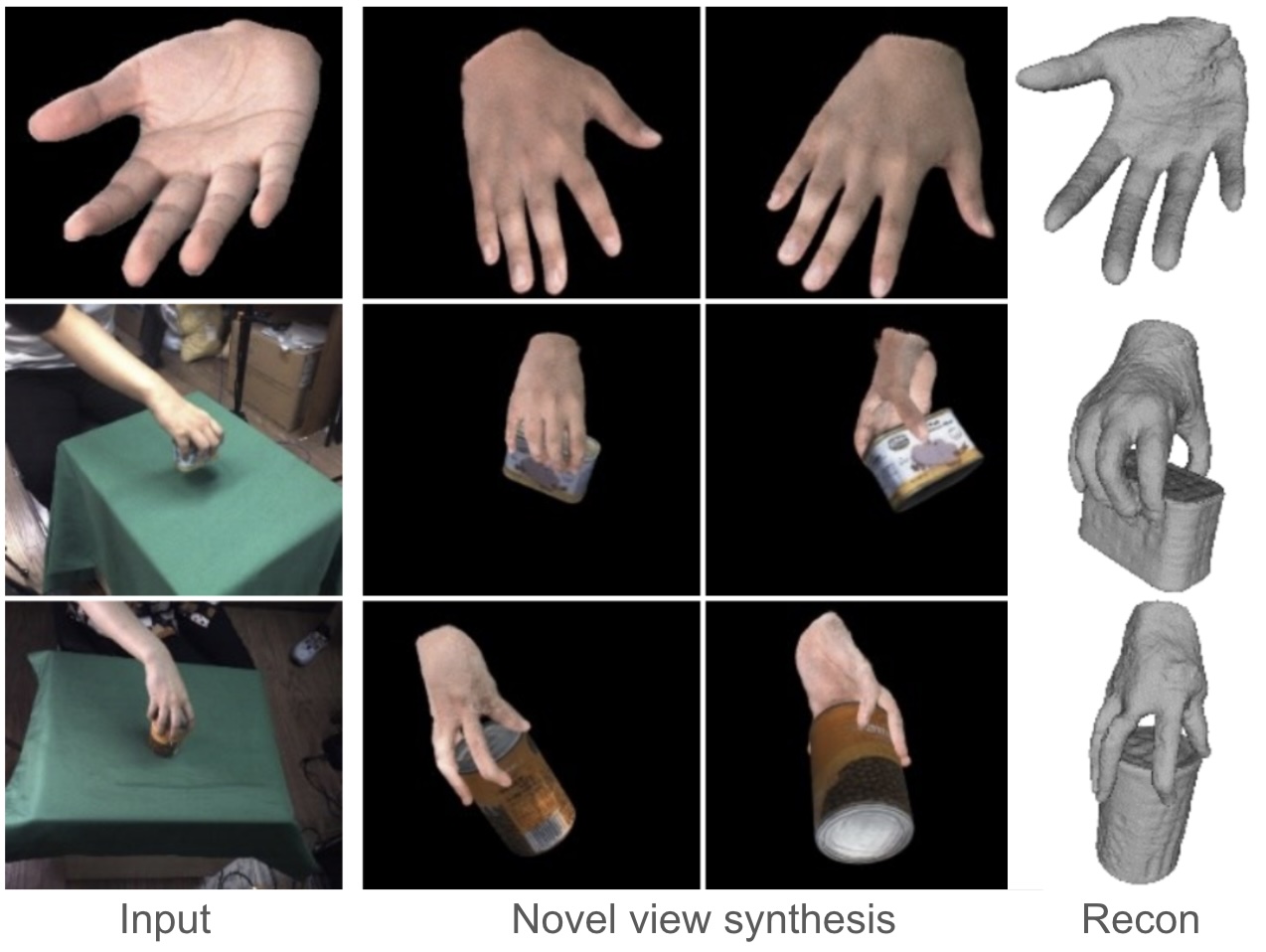 Wentian Qu, Zhaopeng Cui, Yinda Zhang, Chenyu Meng, Cuixia Ma, Xiaoming Deng, Hongan Wang. Novel-view Synthesis and Pose Estimation for Hand-Object Interaction from Sparse Views. ICCV 2023 Project Webpage, Code and Model, Dataset. |